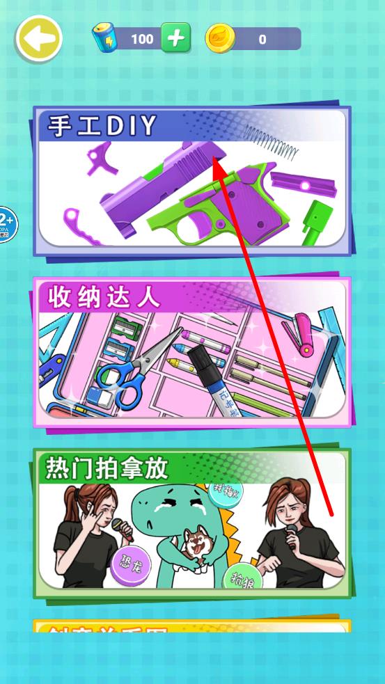 1、点击“手工DIY”进入游戏,映入眼帘的是零件选择界面,滑动屏幕浏览各类玩具零件,点击即可选取,开启拼装之旅。