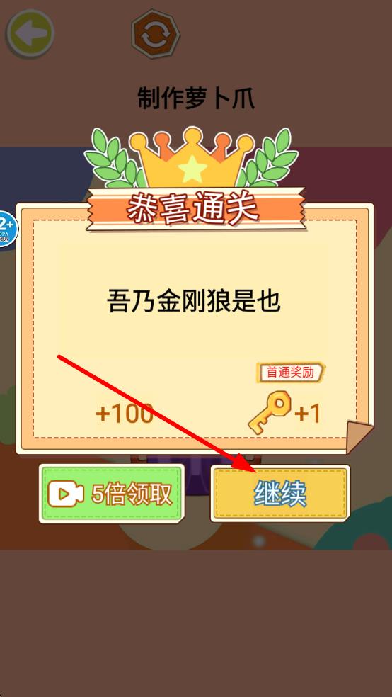 3、完成拼装后,参与战斗对战,用金刚萝卜爪战胜对手,获取奖励;点击“继续”开启新拼装,积累素材打造更强武器。