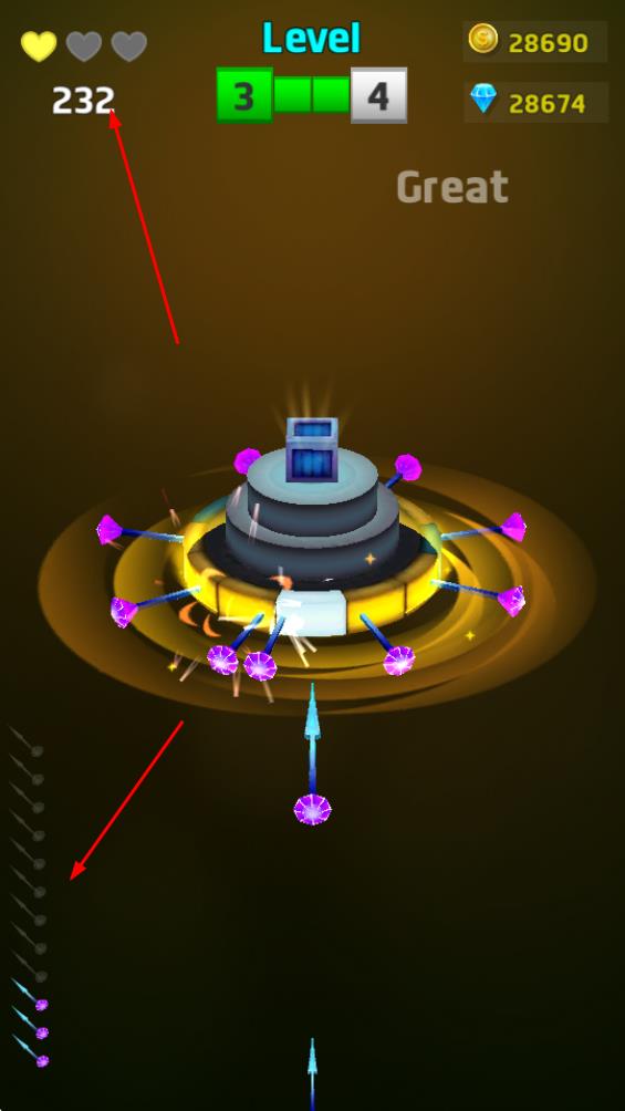 1、瞄准投掷避开已有飞针:观察不断旋转的圆盘,找准时机点击屏幕飞出飞针,确保投掷到目标上且不触碰其余飞针,逐步增加飞针数量,向扎破所有部件努力。