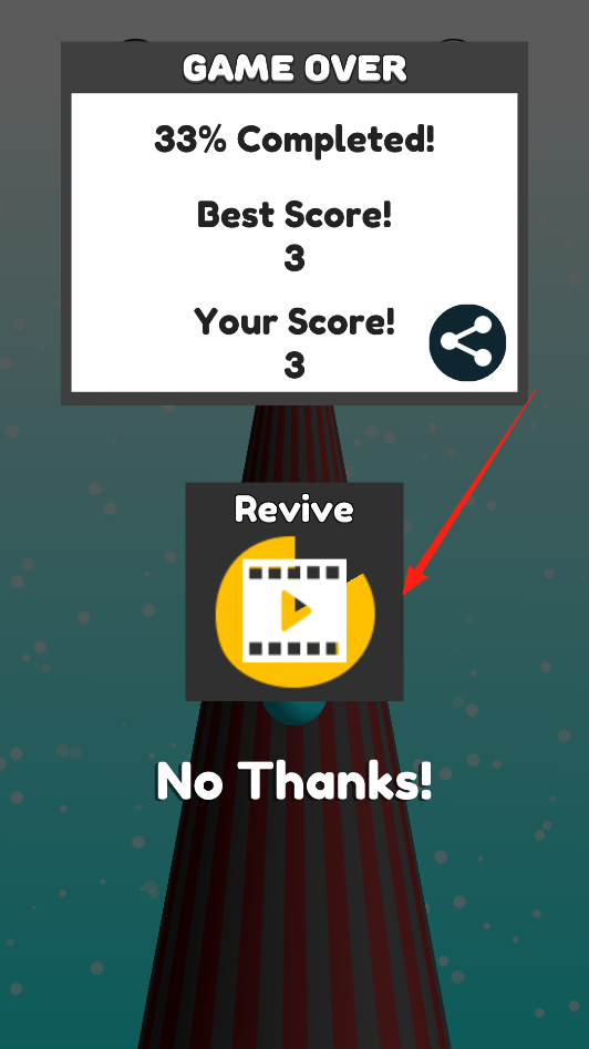3、游戏失败弹出GAME OVER,能看到完成进度和分数,想复活就点Revive看广告,不想看就选No Thanks重新来,调整节奏重新挑战,争取让小球穿更多环打破最高分。