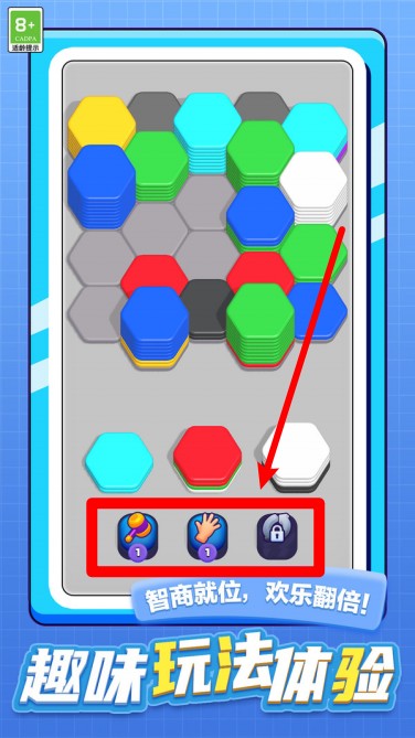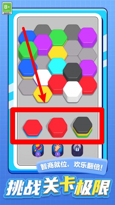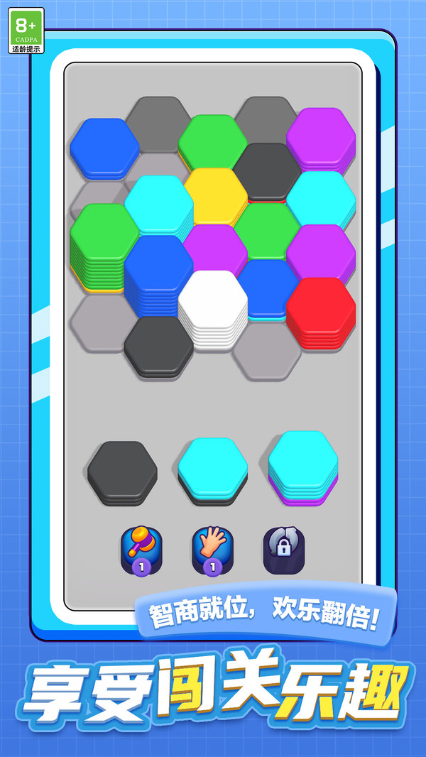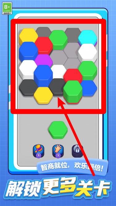 1.不同颜色的六边形方块堆叠整齐,玩家需思考如何排列组合,解锁更多区域,完成指定挑战关卡内容。