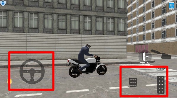 3.摩托操作方式:左下角方向盘图标用于驾驶摩托车进行移动,搭配右侧油门与刹车,城市穿梭畅通无阻。