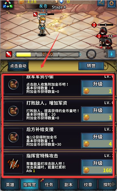 4、点击下方指挥官按键,还可以消耗金币来升级和解锁指挥官技能。