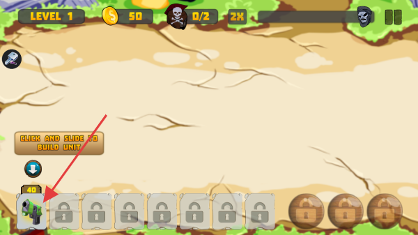 2、进入关卡后,依照提示CLICK AND SLIDE TO BUILD UNIT,点击并滑动解锁的单位如左下角40金币的单位进行部署,合理安排资源出兵。