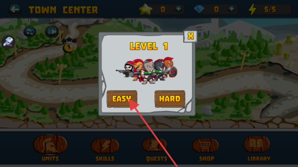 1、游戏初始在TOWN CENTER界面,面对LEVEL 1关卡,可按需选择EASY难度进入,降低前期游戏难度,熟悉基本玩法。