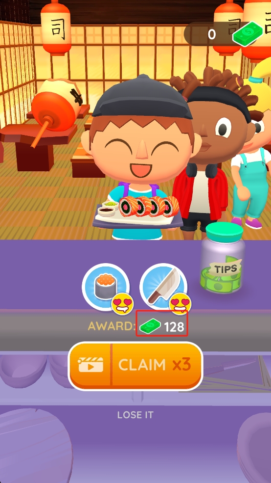 3、完成制作后顾客表示非常满意,获得128现金奖励,可看广告领3倍奖励,积累现金升级食材、店铺,接更多订单。
