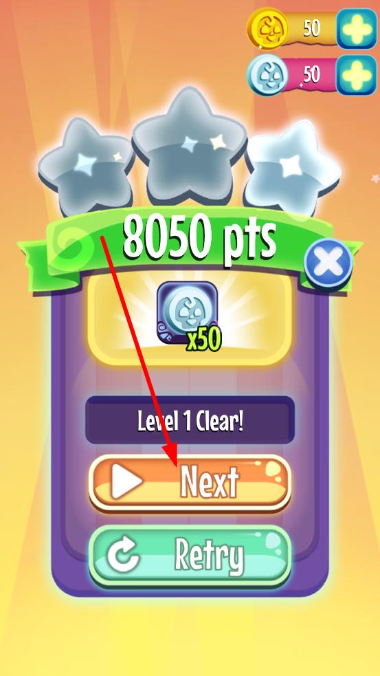 3、关卡挑战与进阶:完成当前关卡目标点击“Next”进阶,未达成选“Retry”重试;积累分数、提升消除能力,解锁隐藏内容,持续拓展游戏体验。