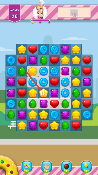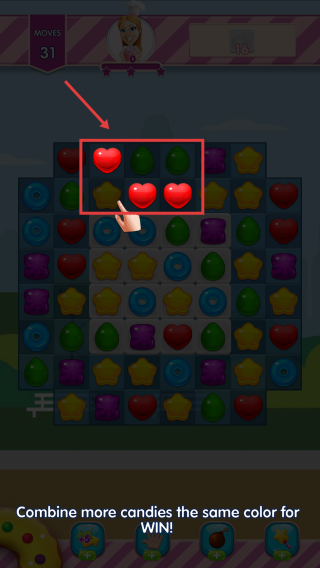 2、观察糖果布局,点击至少3个同色糖果如红色心形,触发消除,获取分数。