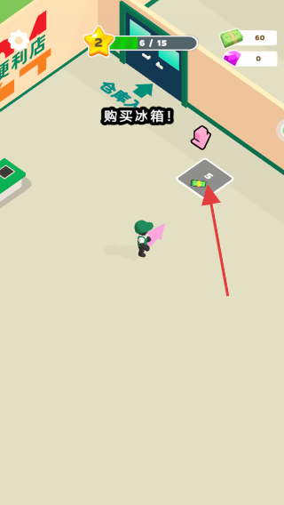 3、出现购买冰箱!提示后,继续用资金点击对应位置购买冰箱,丰富店铺设施,助力店铺经营发展。