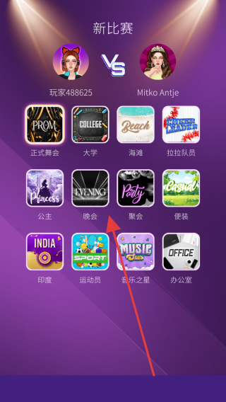 2、在新比赛界面,面对不同主题如晚会,根据比赛要求选择合适主题参与对战。