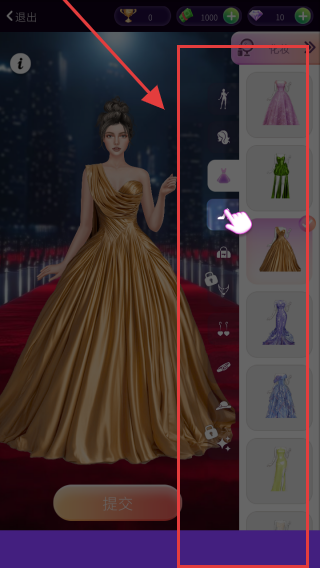 3、选定主题后,进入换装界面,从右侧服装配饰栏挑选搭配如金色礼服,完成搭配后点击提交参与比赛。
