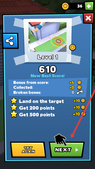 2、在Level-1结束后,进入到结算界面时,点击NEXT按钮,领取奖励,进入下一关选择界面。