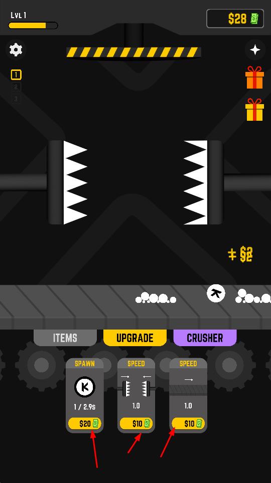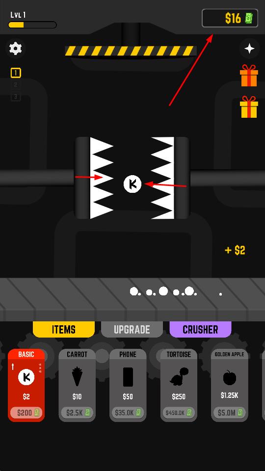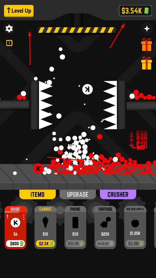 1、在工厂场景中,操控粉碎设备,通过滑动屏幕调整粉碎方向和力度,粉碎物品,获取金钱。