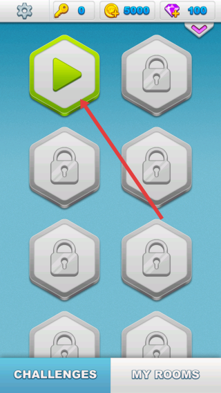1、在挑战界面按提示点击绿色三角箭头按钮,可以进入首个可玩关卡,开启房间装修任务流程。