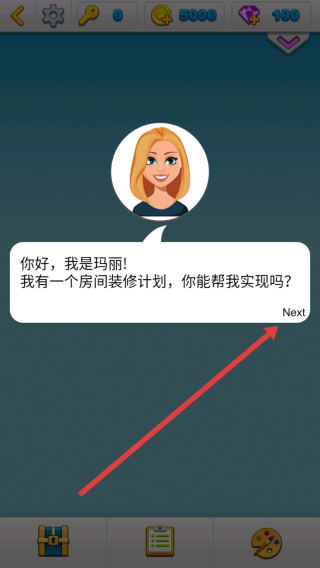 2、遇到玛丽的对话界面,点击Next按钮进行互动,推进剧情,了解房间装修计划的具体需求内容。