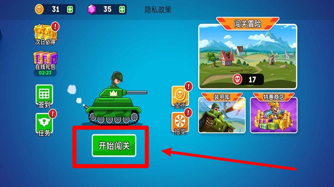1.开启闯关模式:玩家可点击开始闯关,驾驶坦克进入多种冒险场景,灵活操控完成关卡挑战,体验丰富的趣味玩法。
