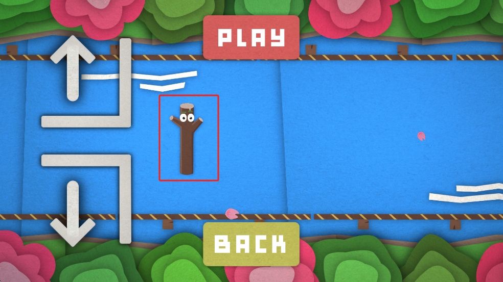 1、点击上方红色PLAY按钮开启游戏,操控树桩角色在河道中顺流前行,提前观察路线,为躲避后续障碍铺垫。
