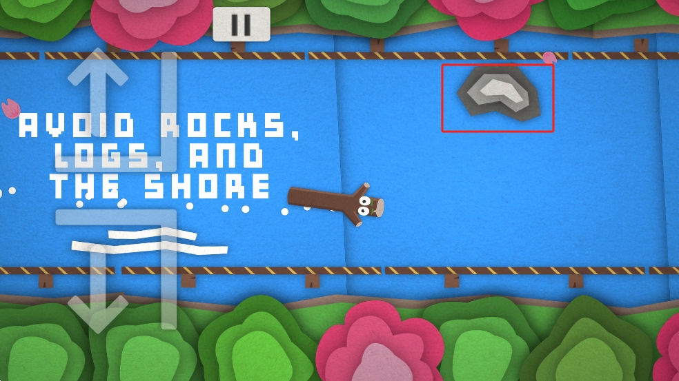 2、游玩时遵循提示,避开红色方框内的岩石,同时远离河道岸边,维持树桩在安全水域移动,稳步突破关卡障碍。
