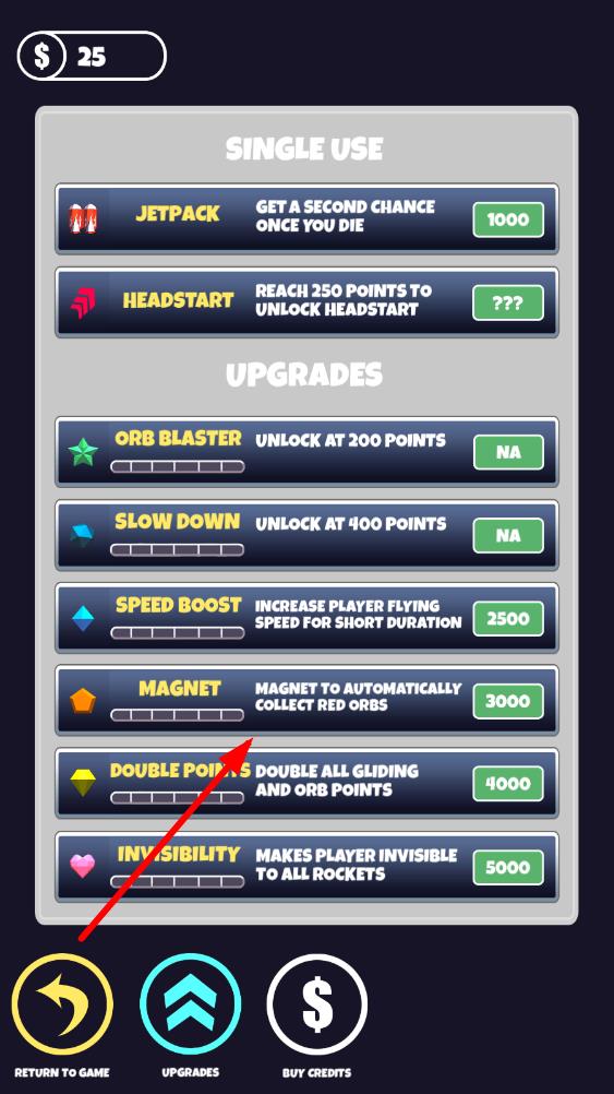 2、操控小机器人飞行的火箭间吸附切换,避开危险障碍,同时收集沿途的能量宝石,保持持续前进,延长飞行距离。