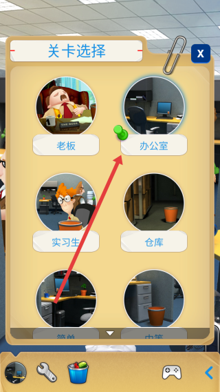 1、在进入关卡选择界面时,可以点击办公室关卡,进入办公室场景,开启纸团投掷挑战。