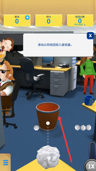 2、进入关卡后,需要按屏幕中的提示滑动纸团,将其精准投入办公室垃圾桶,完成基础投掷任务。