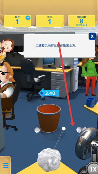 3、在遇到风扇干扰时,需要留意风速风向提示,调整好纸团投掷角度力度,让纸团顺利入桶。