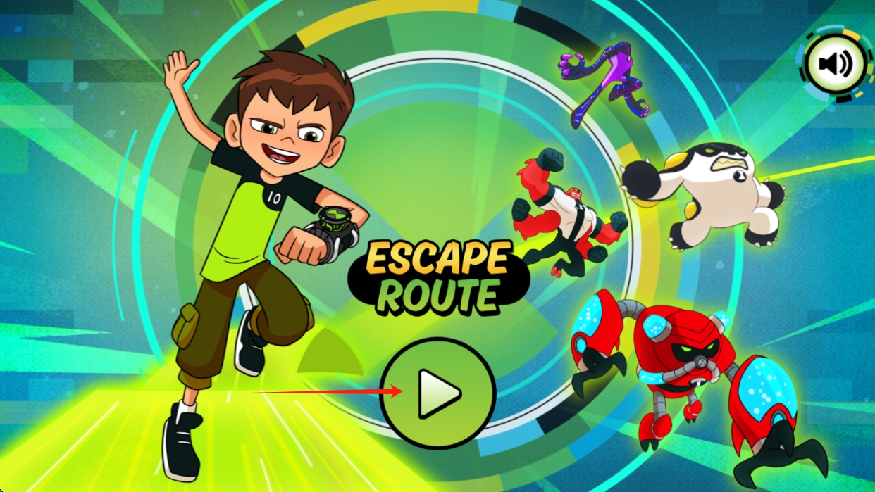 1、在Ben-10-Escape-Route游戏启动界面,点击开始按钮,开启少年骇客的逃生冒险,点击开始游戏。