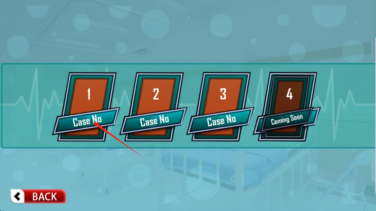 2、进入病例选择界面,跟随箭头提示,选择一个病例,确定医疗任务,为救治患者做好准备,点击选择关卡。