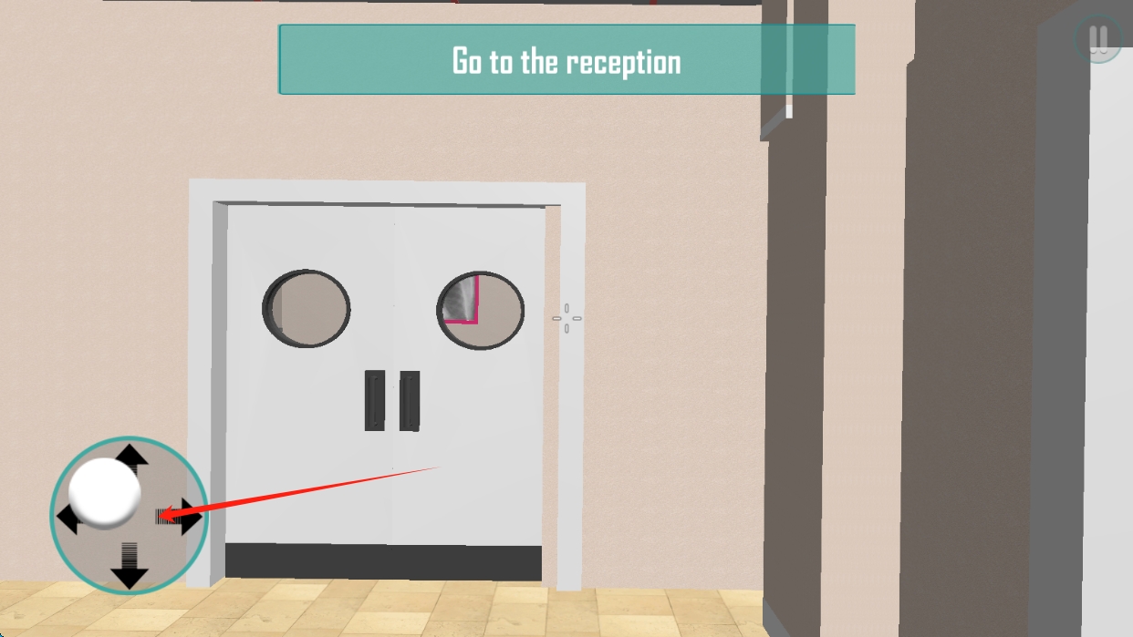 3、在医院场景中,根据箭头提示,操作虚拟摇杆,控制角色移动,前往接待处,开始医疗任务,拨动轮盘移动。