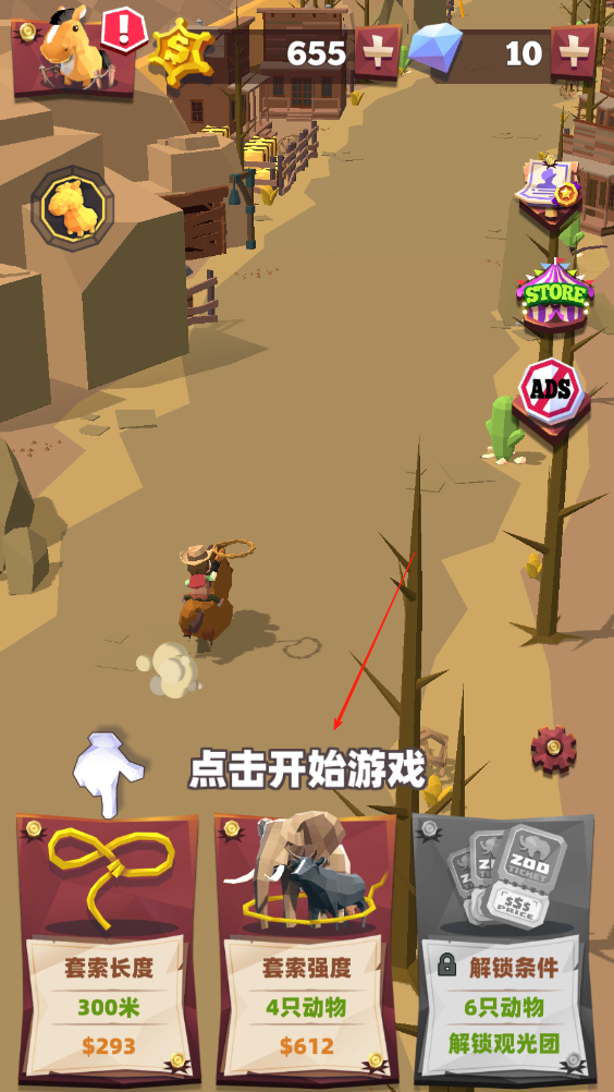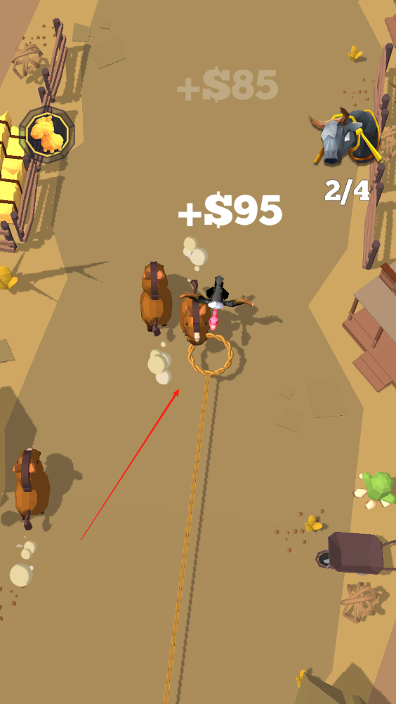 1、点击屏幕,牛仔则会抛出绳索,绳子到达极限长度的时候,会收回,在收回过程中捕捉动物。