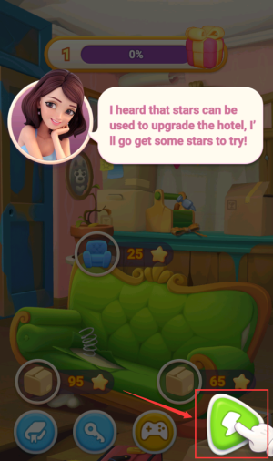 3、点击红框绿色箭头,获取星星升级酒店设施。