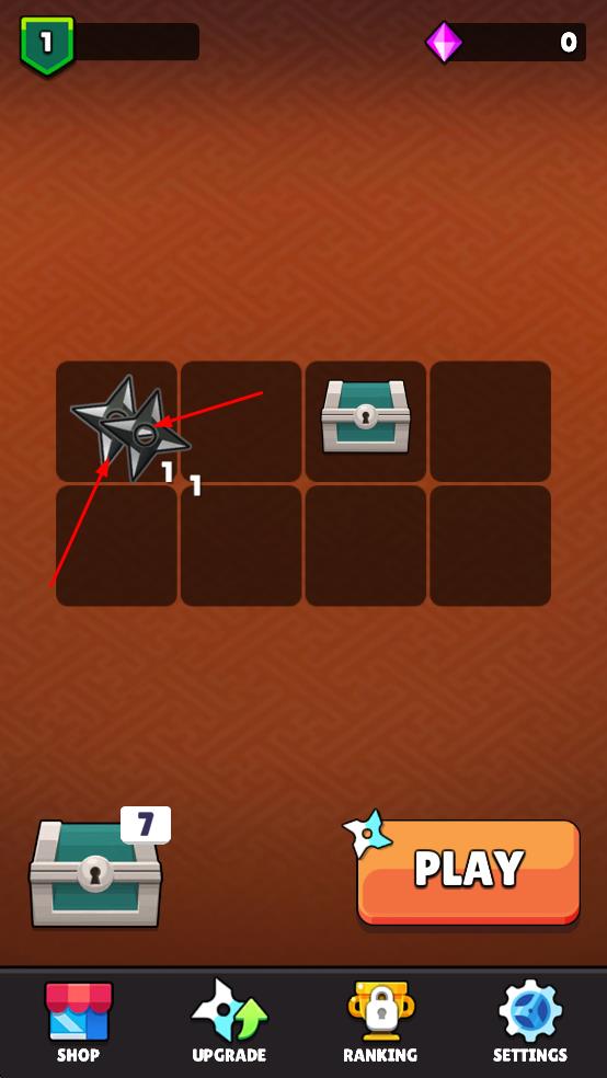 1、查看飞镖库存,收集左下角宝箱,右上角粉色钻石可用于商店购物或飞镖升级,点击橙色PLAY按钮进入关卡,同时可利用底部SHOPUPGRADE等功能管理资源。