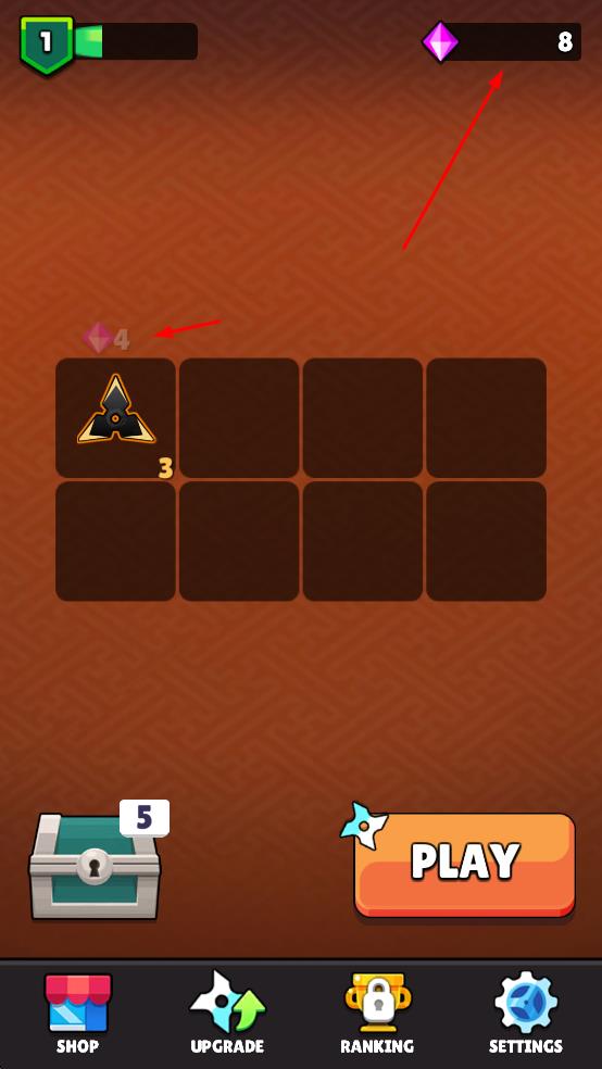 3、通过通关或开启宝箱获取钻石与飞镖道具,钻石可在SHOP购买飞镖或道具,UPGRADE功能用于提升飞镖属性,增强关卡表现,助力后续挑战。