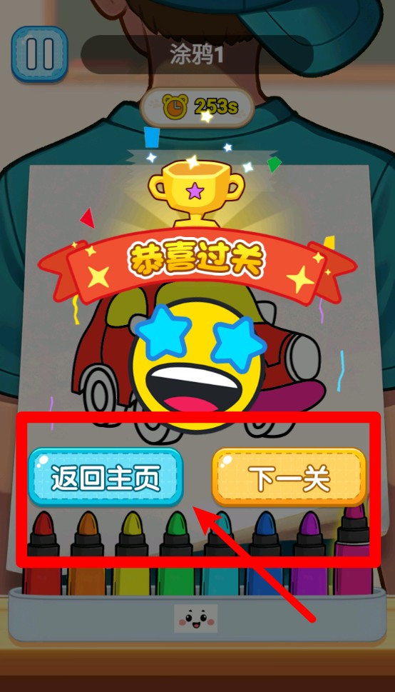 3.过关奖励页面:完成涂鸦后系统会展示通关画面,可选择继续下一关或返回首页,流程简洁流畅不中断创作热情。