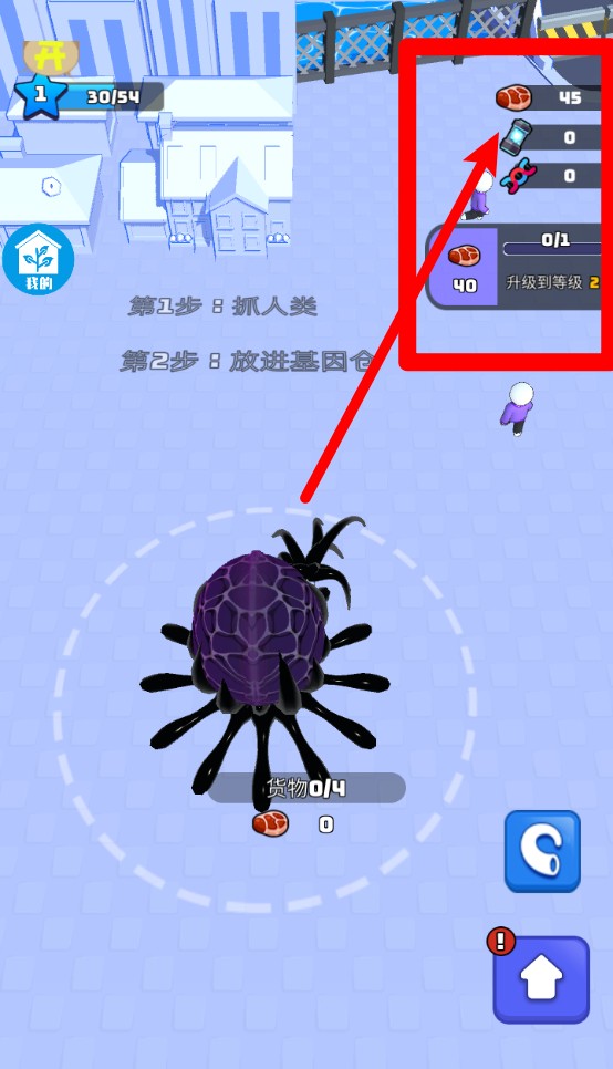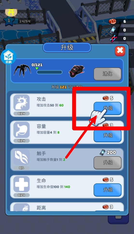 1.收集资源强化能力:右上角显示当前肉块与道具数量,越多资源就能解锁更多强化选项。