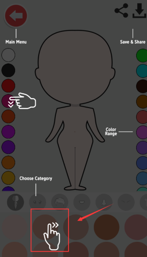 3、滑动红框颜色选择条,调整角色肤色发色。
