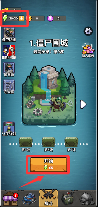 3、左上角红色框框那里是体力,每玩一句消耗5点体力。