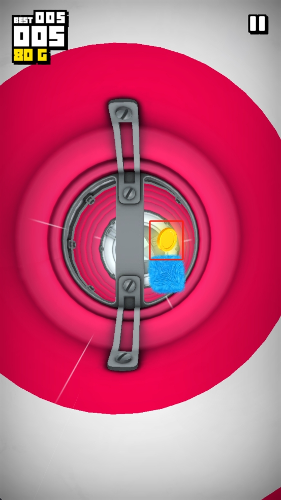 2、在红色环形场景中,操控弹珠移动,瞄准黄色金币,利用通道障碍调整弹珠路径,精准撞击金币,获取分数。