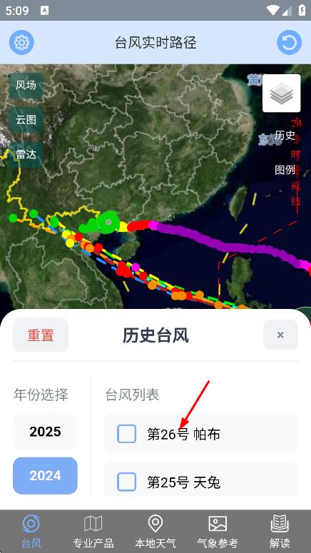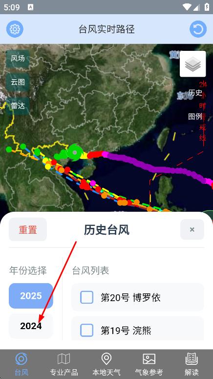 3、点击历史,选择年份,查看该年份历史台风列表。