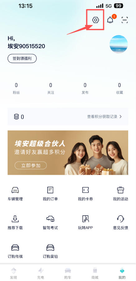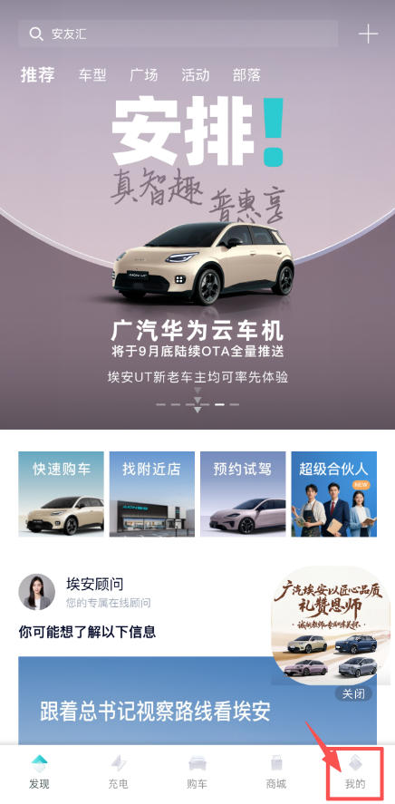 1、打开广汽埃安APP,点击底部我的选项,进入个人中心页面。