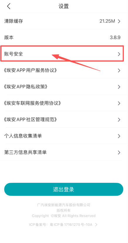 3、在设置页面,点击账号安全选项,进入账号安全管理界面。