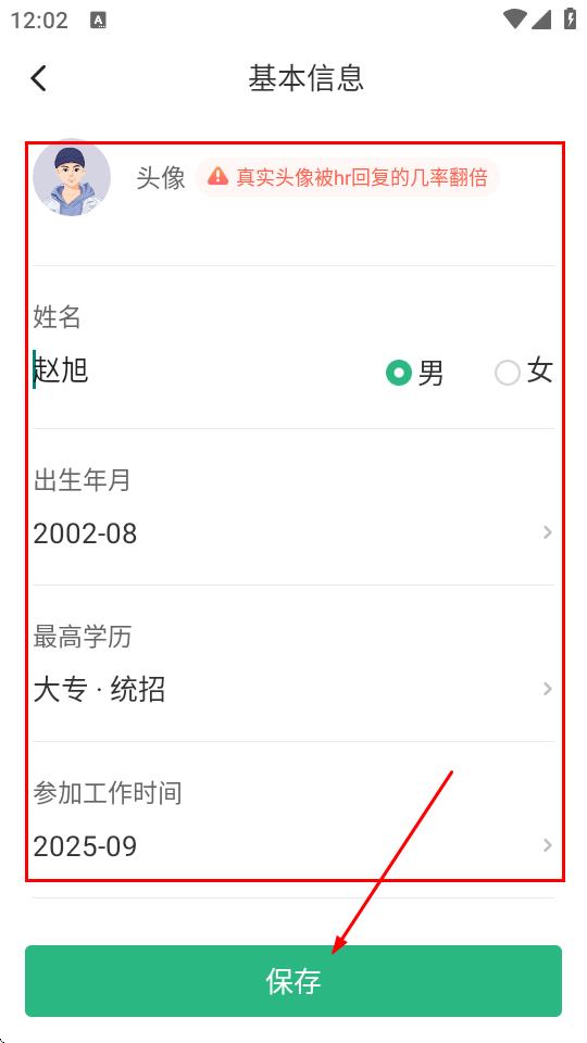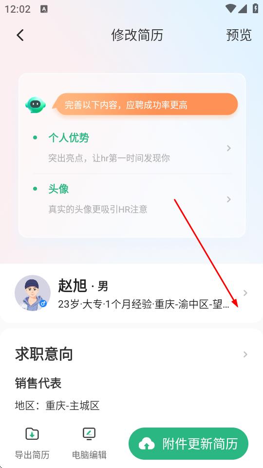 3、进入修改简历页面,点击个人信息区域。
