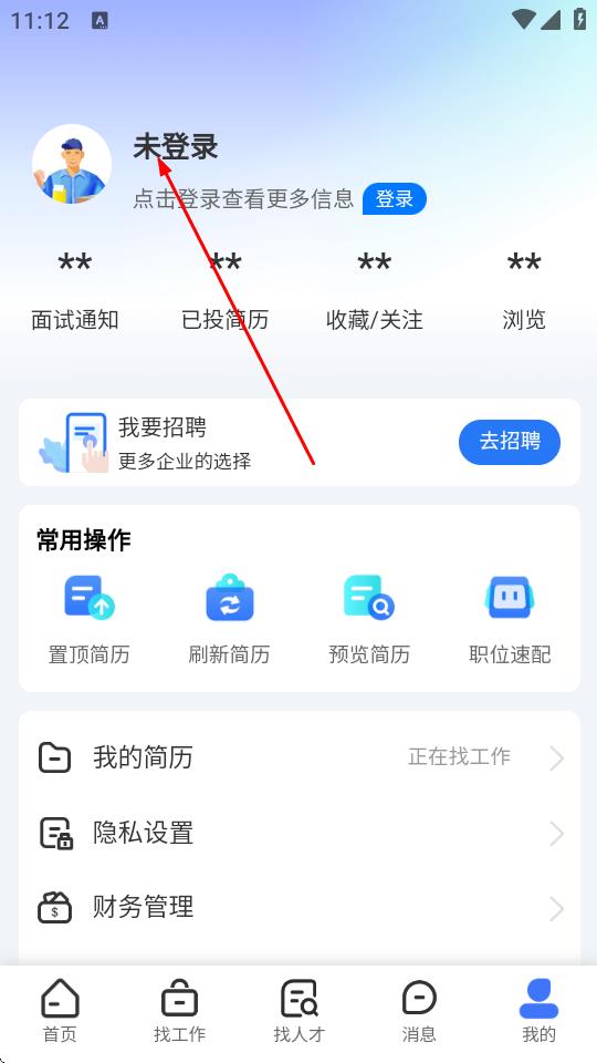 1、打开滕州人才网APP,点击底部导航栏中的我的。
