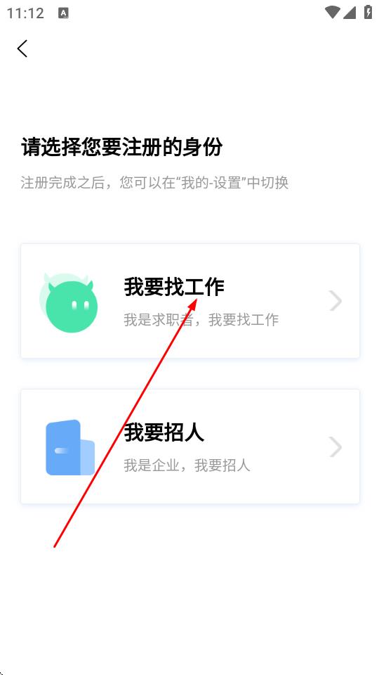 4、在请选择您要注册的身份页面,选择我要找工作。