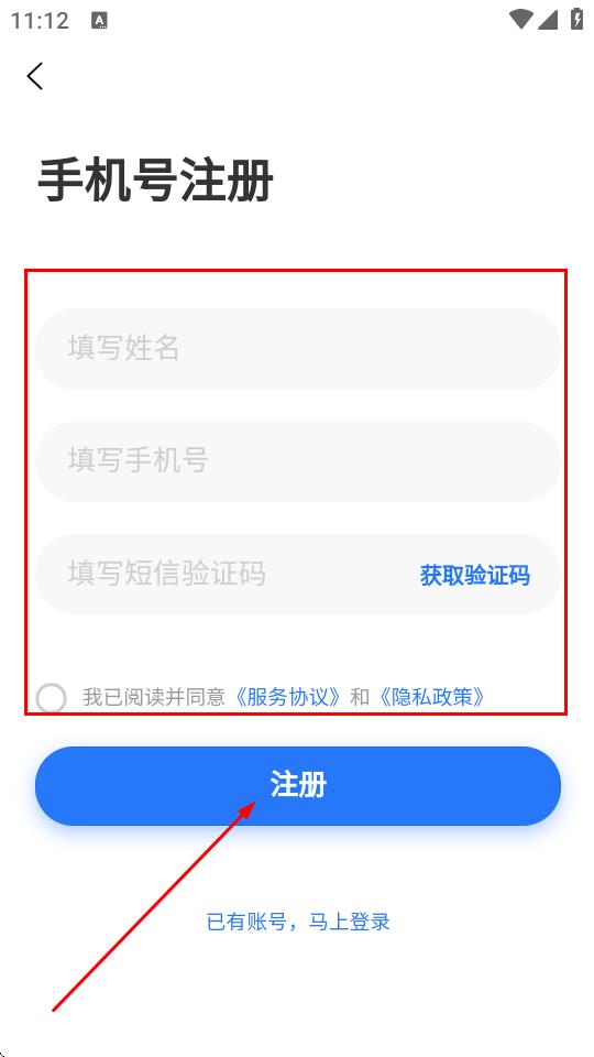 5、进入手机号注册页面,填写姓名、手机号、验证码,勾选同意服务协议和隐私政策,点击注册。