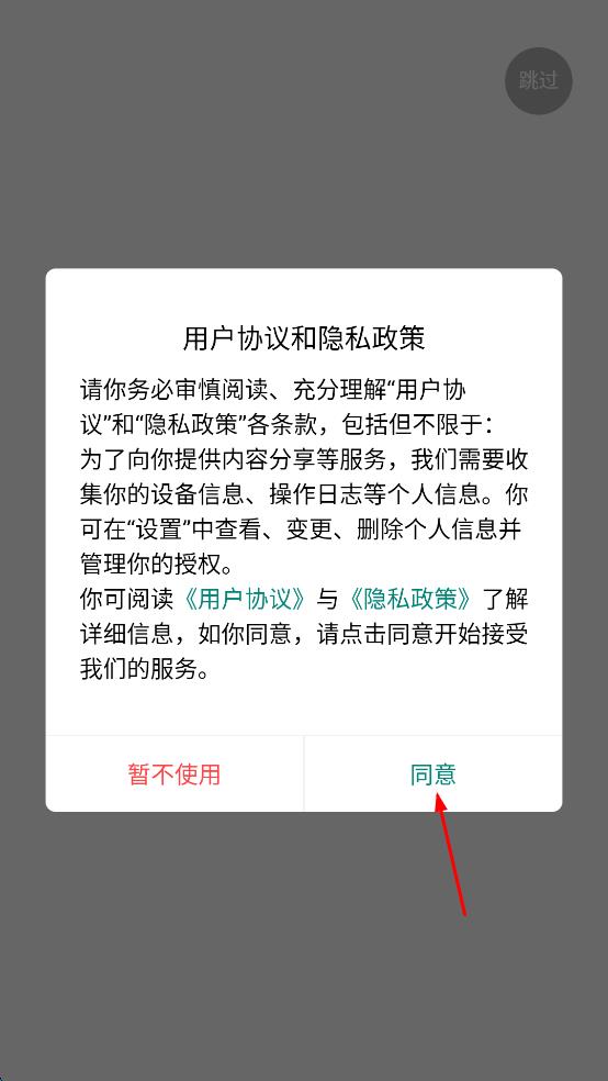 1、打开乐山软件,会弹出用户协议和隐私政策提示框,点击同意,进入软件主界面。