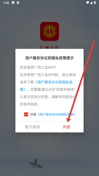 1、在打开广西工会app后,可以点击弹窗中的同意按钮,进入使用。