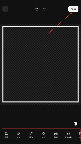 4、调整好画布后,对图片进行裁剪、滤镜、调节等编辑操作,完成编辑后点击右上角的保存按钮。