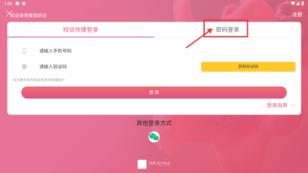 3、在登录选择界面,点击密码登录选项,进入账号密码登录页面。