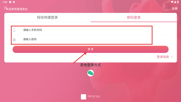 4、在登录页面,输入手机号码和密码,勾选用户协议后点击登录按钮,完成账号登录操作。